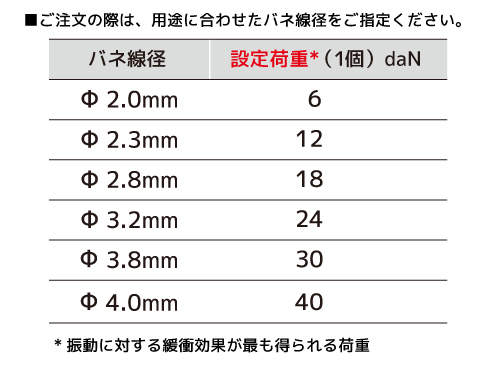 ご注文の際は、用途に合わせたバネ線径をご指定ください。